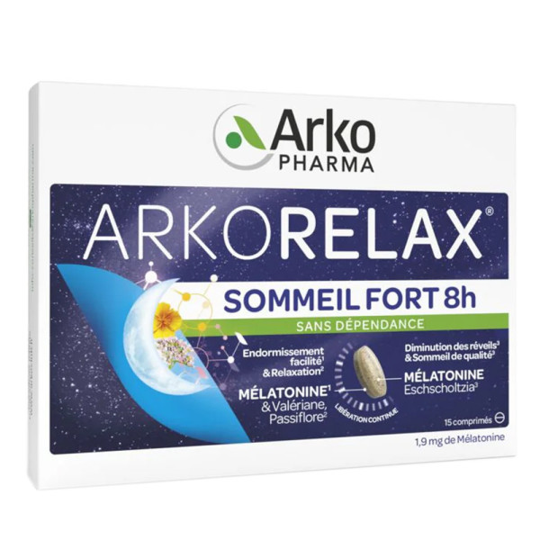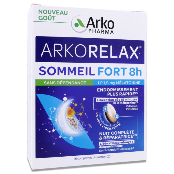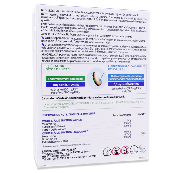 Arkorelax® Sommeil Fort 8H délivre grâce à un comprimé bicouche innovant de la mélatonine ( 1.9 mg ), de la valériane, de la passiflore, de la vitamine B6 ainsi que de l'eschscholtzia. Arkorelax® Sommeil Fort 8H ne provoque pas d'accoutumance ou de somnolence. La mélatonine est une hormone naturelle produite par la glande pinéale. Un dosage de 1 mg de mélatonine participe à la réduction du temps d'endormissement et aide à favoriser un sommeil réparateur. Elle contribue également à réduire les effets du décalage horaire dès 0.5 mg. La valériane contribue au maintien d'un sommeil naturel , elle aide aussi à l'endormissement. De plus, la passiflore contribue au calme et au sommeil. La dernière plante contenue dans ces comprimés est l'eschscholtzia, celle ci participe à une relaxation optimale et améliore la qualité du sommeil.