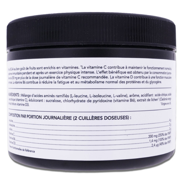 Dosage par portion journalière (9g) : BCAA : 8 g L-leucine : 4 g L-isoleucine : 2 g L-valine : 2 g Vitamine C : 200 mg (250% des VNR**) Vitamine B6 : 1,4 mg (100% des VNR**) Vitamine D3 : 2,4 μg (48% des VNR**).. *Valeurs Nutritionnelles de Référence. **Origine non UE.