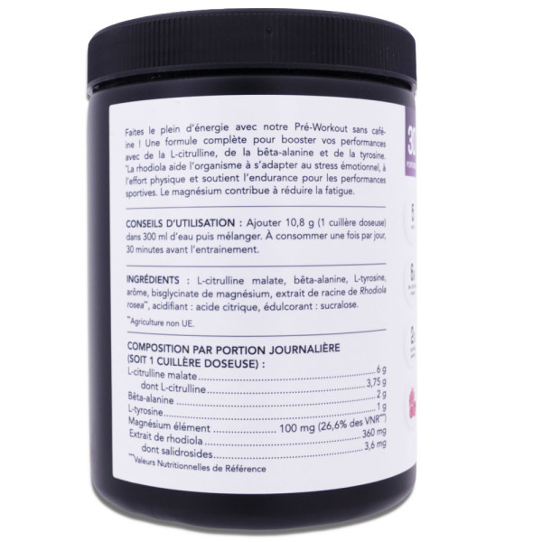 Ingrédients : L-citrulline malate, bêta-alanine, L-tyrosine, arôme, bisglycinate de magnésium, extrait de racine de Rhodiola rosea*, acidifiant : acide citrique, édulcorant : sucralose.