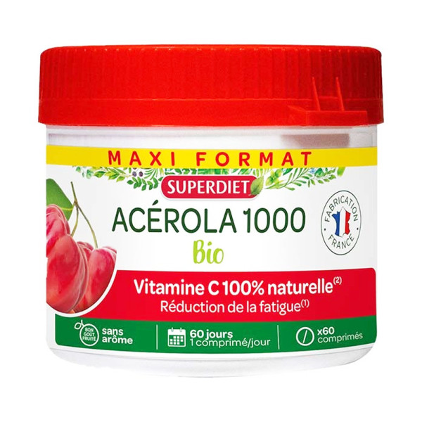 ACEROLA 1000 de SUPER DIET est un complément alimentaire conditionné sous forme de comprimés à croquer à base d’Acérola également appelée cerise du Brésil, naturellement riche en vitamine C (teneur 80 fois supérieure à l’orange).