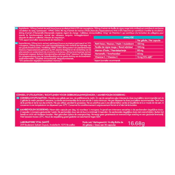 150mg d’extrait de petit houx (ruscus aculeatus) titré à 10% de ruscogénine, 100mg d’extrait de feuille de vigne rouge (vitis vinifera) qui contribue à une bonne circulation du sang. Epaississant : HPMC E464, 80 mg d’extrait de marron d’Inde (Aesculus hippocastanum) titré à 10% l'aescine qui contribue à tonifier la circulation, 60mg d’extrait d’Hamamélis (Hamamelis virgiana). Agent de charge : Cellulose microcristalline. 12mg* de Vitamine C qui contribue à la formation de collagène pour assurer le fonctionnement normal des vaisseaux sanguins. Antiagglomérant : dioxyde de silicium colloïdal, stéarate de magnésium. *15% apport journalier recommandé de vitamine C