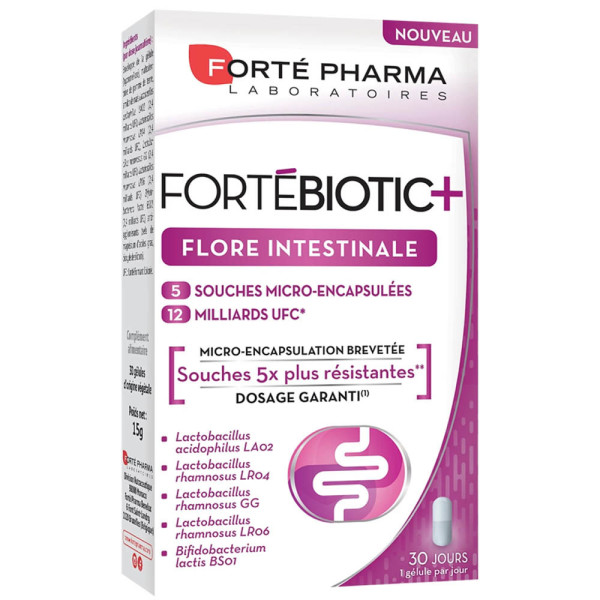Depuis 1999, les Laboratoires FORTÉ PHARMA proposent des produits de qualité, efficaces, sûrs, de grande tolérance pour contribuer aux ressources vitales de chacun. FortéBiotic+ Flore Intestinale est l’association innovante de 5 souches microbiotiques micro-encapsulées (Lactobacillus acidophilus LA02, Lactobacillusrhamnosus LR04, Lactobacillus rhamnosus GG, Lactobacillus rhamnosus LR06, Bifidobacterium lactis BS01.).