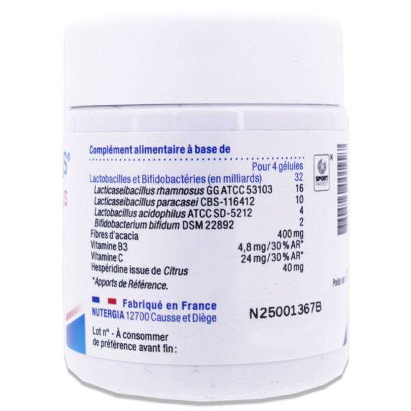 Le laboratoire Nutergia, reconnu pour son expertise en micronutrition, propose une formule innovante avec ERGYPHILUS PLUS. Ce complément alimentaire contient 4 souches de probiotiques vivantes, dosées à 8 milliards par gélule, non microencapsulées, pour une action optimale. Ces souches contribuent à l'équilibre de la flore intestinale, essentiel au confort digestif. La présence de vitamine B3 et de vitamine C contribuent respectivement au fonctionnement normal du système immunitaire et au maintien des muqueuses saines dont l'intestin.