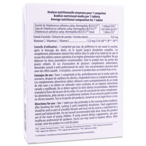 Edulcorant : sorbitol, extrait de fruit d'acérola (Malpighia glabra) titré en vitamine C, arôme naturel fraise, souche de Streptococcus salivarius subsp. thermophilus BLIS K12TM, antiagglomérants : acides gras et carbonate de magnésium.
