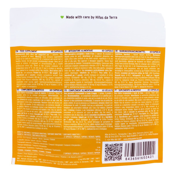Ce complément alimentaire est conçu par le laboratoire Hifas da Terra, reconnu pour son expertise en mycothérapie.Il contient des substances bioactives extraites des champignons Maitake (Grifola frondosa) et Polypore (Polyporus umbellatus), optimisées avec de la vitamine C naturelle issue de l’acérola pour augmenter la biodisponibilité des extraits de champignons. Les extraits de champignons sont utilisés pour leurs propriétés médicinales. .Ce produit est proposé en éco-recharge, respectueuse de l'environnement, permettant de réduire l'empreinte écologique.