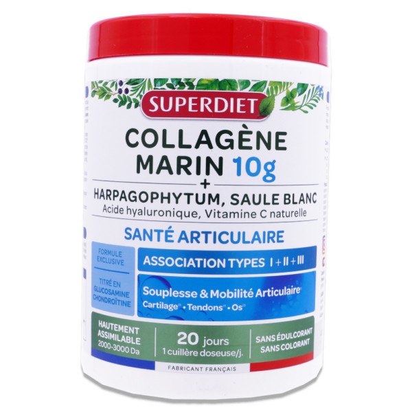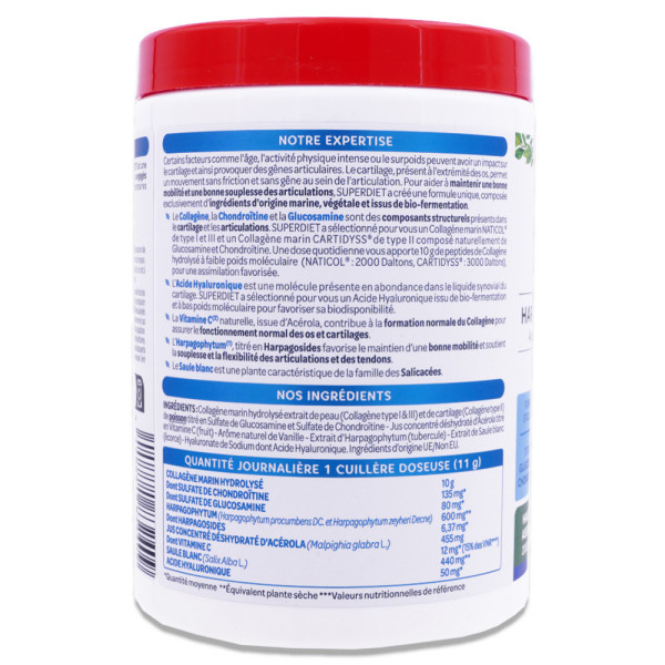 Le laboratoire Superdiet propose une formule innovante combinant des ingrédients d'origine marine, végétale et issus de bio-fermentation. Les collagènes marins NATICOL types I et III et CARTIDYSS type II apportent chaque jour 10g de peptides de collagène hydrolysé. On trouve naturellement du collagène, de la chondroïtine et de la glucosamine dans les articulations et le cartilage. L'acide hyaluronique, qui favorise l'hydratation des tissus, est ajouté pour améliorer la biodisponibilité. La vitamine C naturelle de l'acérola soutient la formation normale de collagène, essentielle pour le bon fonctionnement des os et des cartilages. L'harpagophytum contribue à la flexibilité articulaire, et le saule blanc complète la formule. Un arôme naturel de vanille agrémente ce complément pour une prise agréable.