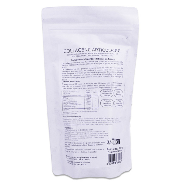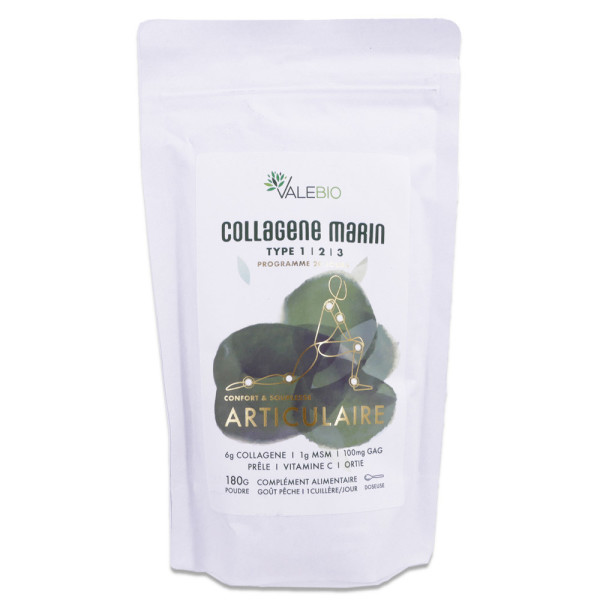 Ce complément alimentaire est formulé par le laboratoire Valebio, reconnu pour son engagement à utiliser des ingrédients de haute qualité. Le collagène est une protéine qui se trouve dans la peau, les muscles, les cartilages, les ligaments, les tendons et les os. Le MSM, la glucosamine et la chondroïtine (GAG) sont intégrés à la formule. La prêle et l’ortie sont des plantes connues pour leur richesse en minéraux : l'ortie aide à renforcer les os en participant à leur reminéralisation naturelle, tandis que la prêle aide à maintenir des articulations souples. La vitamine C provenant de l’acérola soutient la formation normale de collagène, essentielle pour le bon fonctionnement des os et des cartilages. Ce produit est proposé sous forme de poudre à diluer, saveur pêche, pour une utilisation facile et agréable.