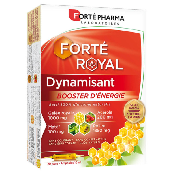 Les laboratoires FORTÉ PHARMA ont élaboré différentes gammes et univers de produits pour vous accompagner dans la vie de tous les jours et vous aider à rester en forme, à préserver votre capital santé et beauté. L’univers Énergie de FORTÉ PHARMA propose notamment les gammes de compléments alimentaires Energie immédiate, Forme et Tonus et sexualité masculine.FORTE ROYAL Dynamisant Booster d’énergie de Forté Pharma est un véritable concentré de produits de la ruche. La Gelée Royale est produite par les abeilles à partir du pollen rapporté à la ruche par les ouvrières. Elle contient de la vitamine B, des minéraux et oligo-éléments. Les abeilles l’utilise pour nourrir exclusivement l’abeille qui deviendra la Reine de la ruche et qui vivra plus longtemps. Complétée par de la vitamine C qui réduit la fatigue, de l'Acérola (petite cerise) riche en vitamine C, et de l’extrait de maté (riche en caféine) qui contribue à la résistance contre la fatigue mentale et physique, ce complément alimentaire en ampoules est sans colorant, sans conservateur, sans alcool.