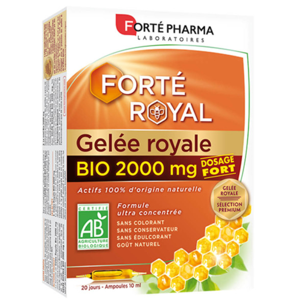 Depuis 1999, les Laboratoires FORTÉ PHARMA proposent des produits efficaces et innovants, compléments alimentaires aux formules issues de la recherche en nutrition cellulaire. Les compositions synergiques associent des micro-nutriments naturels en dosage optimal afin d'aider de façon ciblée le bien être quotidien. Ainsi FORTE PHARMA a développé 5 gammes complètes : minceur, énergie, santé, beauté, Phyto-bio, proposant des produits de qualité, efficaces, sûrs, de grande tolérance pour le bien être de chacun.Gelée Royale 2000 mg bio est un véritable concentré d'actifs 100 % d'origine naturelle sans conservateur. La Gelée Royale est produite par les abeilles à partir du pollen rapporté à la ruche par les ouvrières. Très riche en vitamine B, minéraux et oligo-éléments, La gelée royale est bénéfique pour les abeilles grâce à ses propriétés nutritives et antibactériennes.