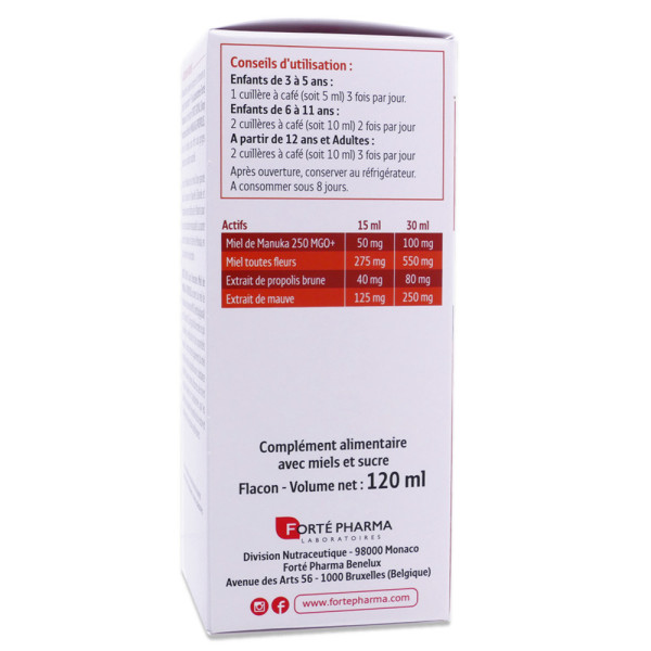 Le laboratoire Forte Pharma propose une gamme de produits à base d'ingrédients naturels soigneusement sélectionnés. Ce sirop associe le miel de Manuka, reconnu pour ses propriétés uniques, à la propolis brune, une substance résineuse produite par les abeilles. La mauve, ingrédient principal de ce complément alimentaire, est connue pour contribuer au confort respiratoire et soutenir la fonction normale des voies respiratoires mais également à apaiser la gorge en cas d'irritation. Le goût de miel offre une saveur douce et agréable, rendant la prise de ce sirop particulièrement plaisante. Ce produit est conçu pour ceux qui cherchent à soutenir naturellement le fonctionnement de leur système respiratoire.