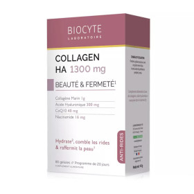 Le complément alimentaire Biocyte Collagen HA est spécialement conçue pour améliorer la qualité de la peau et retarder les signes de l'âge. Les 80 gélules de BIOCYTE COLLAGEN HA 1300 MG BEAUTE & FERMETE contiennent une dose élevée de collagène et d'acide hyaluronique, deux composants essentiels pour maintenir la fermeté et l'élasticité de la peau. Le collagène marin de type I de bas poids moléculaire (2000 Da), possède des propriétés repulpantes et raffermissantes. En plus de cela, il contient de l'Acide Hyaluronique et du Coenzyme Q10, deux actifs reconnus pour leur action anti-âge, ainsi que de la Niacinamide, une forme de vitamine B3 qui agit directement sur la qualité de la peau. En prenant régulièrement ce complément alimentaire, vous pouvez améliorer la qualité de votre peau et réduire les signes de l'âge tels que les rides et les ridules.