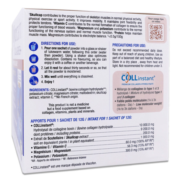 Complément alimentaire à base de plante, vitamines et minéraux. COLLinstant : hydrolysat de collagène bovin**; citrate de potassium ; citrate de magnésium, maltodextrine ; extrait de scutellaire ; vitamine C. ** Non Origine France. Hydrolysat de collagène bovin.10 000 mg dont protéines 9 200 mg• Extrait de Scutellaire.200 mg soit en équivalent plante 1 000 mg • Vitamine C 80 mg (100% AR*) • Magnésium (forme citrate) 56.25 mg (15% AR*) • Potassium (forme citrate) 300 mg (15% AR*). *AR : Apports de référence.