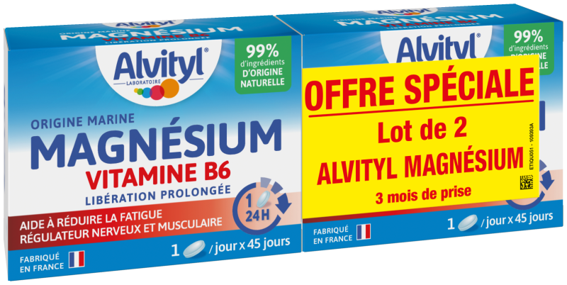 ALVITYL MAGNESIUM VITAMINE B6, est un complément alimentaire conditionné sous forme de comprimés et contient du Magnésium d’origine marine et de la vitamine B6. Le magnésium et la vitamine B6 agissent pendant 24 heures afin de contribuer à réduire significativement la fatigue et participer à un métabolisme énergétique normal. Ces actifs maintiennent une fonction psychologique normale et régulent le système nerveux et musculaire.