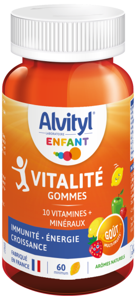 ALVITYL Vitalité Gommes au goût fruité à prix pas cher, un complexe composé de 10 vitamines dans votre parapharmacie en ligne pas cher,à base de Vitamines et minéraux dont la vitamine C et D qui participe au défenses naturelles de l'organisme. (à partir de 4 ans)