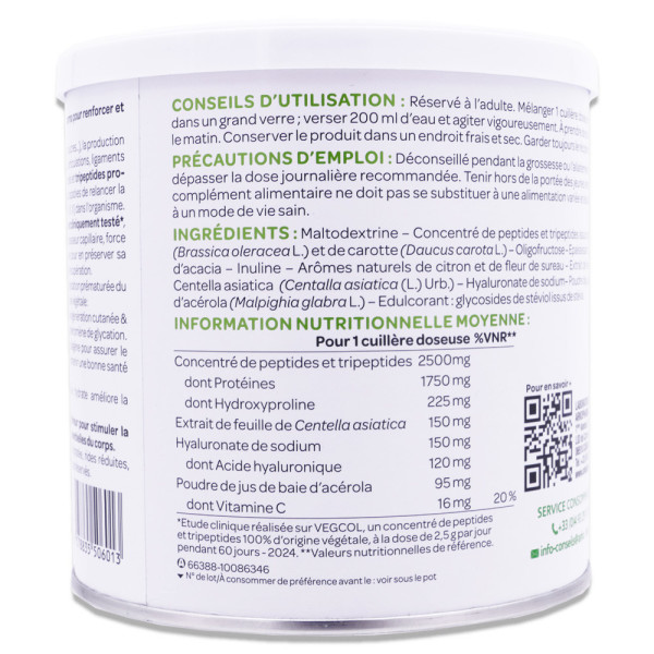 Maltodextrine – Concentré de peptides et tripeptides issus de brocoli (Brassica oleracea L.) et de carotte (Daucus carota L.) – Oligofructose – Epaississant : gomme d’acacia – Inuline – Arômes naturels de citron et de fleur de sureau – Extrait de feuilles de Centella asiatica (Centalla asiatica (L.) Urb.) – Hyaluronate de sodium– Poudre de jus de baie d’acérola (Malpighia glabra L.) – Edulcorant : glycosides de stéviol issus de stévia.