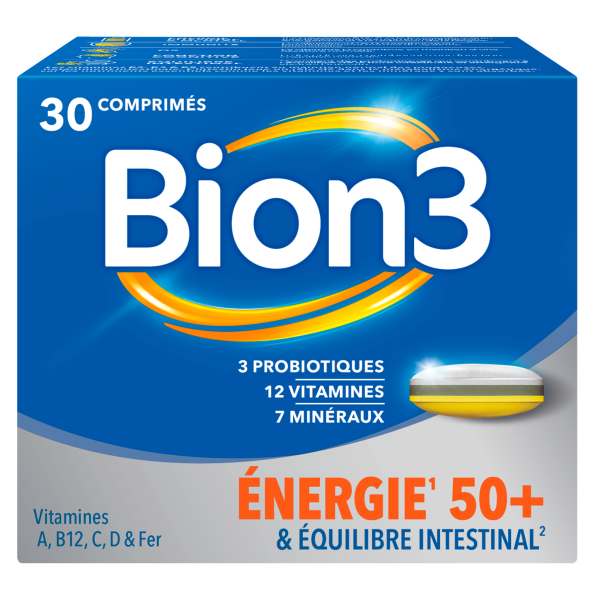 Bion®3 Vitalité 50+ est spécialement adapté aux adultes dès 50 ans, composé d’ une combinaison d'ingrédients destinés à aider au bien être de l'organisme. Bion®3 Seniors contient : 3 ferments lactiques , 12 vitamines : A, B1, B2, B3, B5, B6, B8, B9, B12, C, D, E, et 7 sels minéraux iode, fer, zinc, sélénium, chrome, manganèse, mobyldène en dosages optimaux.Il comprend également des extraits de ginseng , des extraits de myrtille et de lutéine.