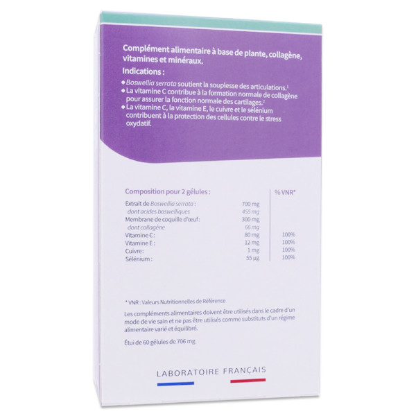 Le laboratoire Codifra propose une formule innovante pour le confort des articulations. La membrane de coquille d'œuf Mkare® est une source naturelle de collagène, élastine, acide hyaluronique et glycosaminoglycanes. Le Boswellia serrata, une plante reconnue, contribue au confort et à la souplesse des articulations. La vitamine C participe à la formation normale de collagène pour assurer la fonction normale des cartilages. Le cuivre, les vitamines C et E, et le sélénium participent à la protection des cellules contre le stress oxydatif.