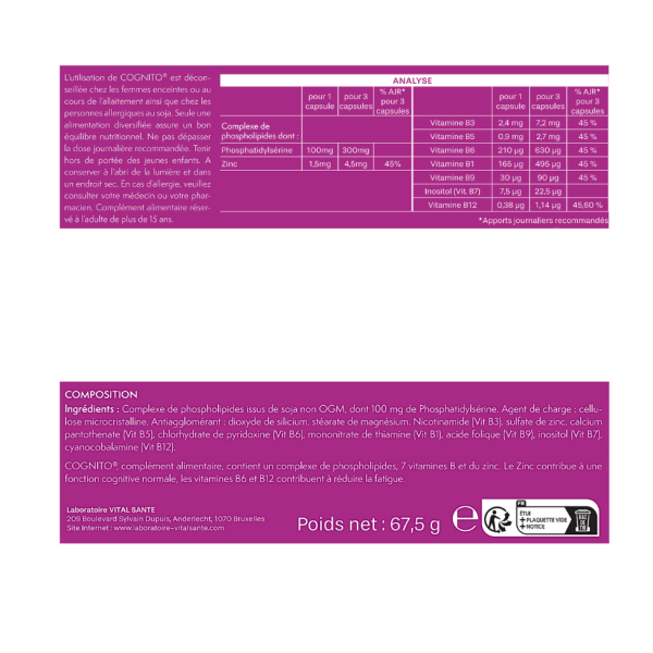 Cognito Mémoire du laboratoire VITAL SANTE disponible en vente en ligne à prix pas cher sur Beautyshop soutient les fonctions cognitives grâce à la phosphatidylsérine, au zinc et aux vitamines B, optimisant la mémoire et la concentration pour tous les âges.