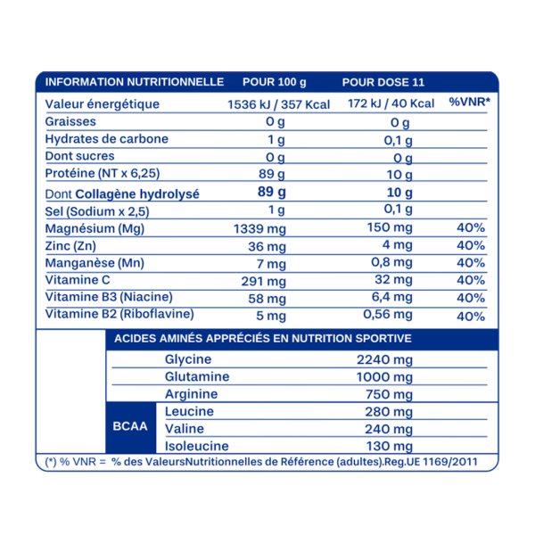 Pour 100g : Valeur énergétique 1564kJ/364 kcal, Graisses 0g dont saturés 0g, Protéine 91g dont Collagène hydrolysé 91g, Hydrates de carbone 1g dont sucres 0g, Sel 1g, Magnésium 1364mg, Zinc 36 mg, Manganèse 7 mg, Vitamine C 291mg, Vitamine B3 58mg, Vitamine B2 5 mg,