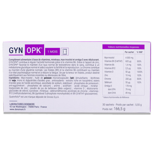 Composition nutritionnelle et valeurs nutritionnelles de référence (VNR) pour 1 sachet :Myo-inositol : 4000 mgVitamine B9 (5-MTHF) : 600 ug - 300% VNRVitamine B6 : 1,4 mg - 100% VNRVitamine B12 : 2,5 ug - 100% VNRVitamine D : 50 ug - 1000% VNRZinc : 10 mg - 100% VNRChrome : 200 ug - 500% VNRSélénium : 55 ug - 100% VNROméga 3 : 178 mg (dont EPA : 79 mg ; DHA : 59 mg)Allergènes : lait, poisson, soja