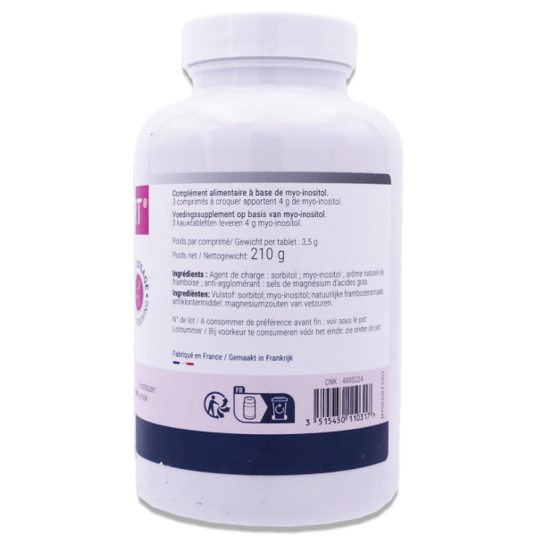Myo-inositol ; agent de charge : sorbitol ; poudre de framboise (Rubus idaeus) ; arôme naturel de framboise ; anti-agglomérant : sels de magnésium d'acides gras.Composition : Myo-Inositol : 4 g (forme biologiquement active