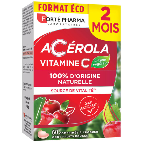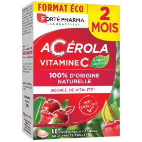 Les laboratoires FORTÉ PHARMA ont élaboré différentes gammes et univers de produits pour vous accompagner dans la vie de tous les jours et vous aider à rester en forme. L’univers Énergie de FORTÉ PHARMA propose notamment les gammes de compléments alimentaires Energie immédiate et Forme et Tonus. ACÉROLA Vitamine C est formulé à base d’extrait sec d'Acérola titré à 25% en Vitamine C . Il se distingue par son goût naturel fruits rouges qui rappelle son composant principal. EN effet, L’Acérola, cette petite “cerise” originaire d’Amérique du Sud qui contient naturellement de la vitamine C est le composé essentiel de ce complément alimentaire. La vitamine C contribue à réduire la fatigue et participe aux fonctions de défenses naturelles. Contenu dans une boîte de 60 comprimés, vous pouvez le prendre occasionnellement ou en programme de 60 jours.