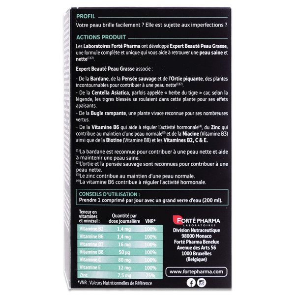 FORTE PHARMA EXPERT BEAUTE PEAU GRASSE 30 COMPRIMES est disponible en vente en ligne à prix pas cher sur Beautyshop.