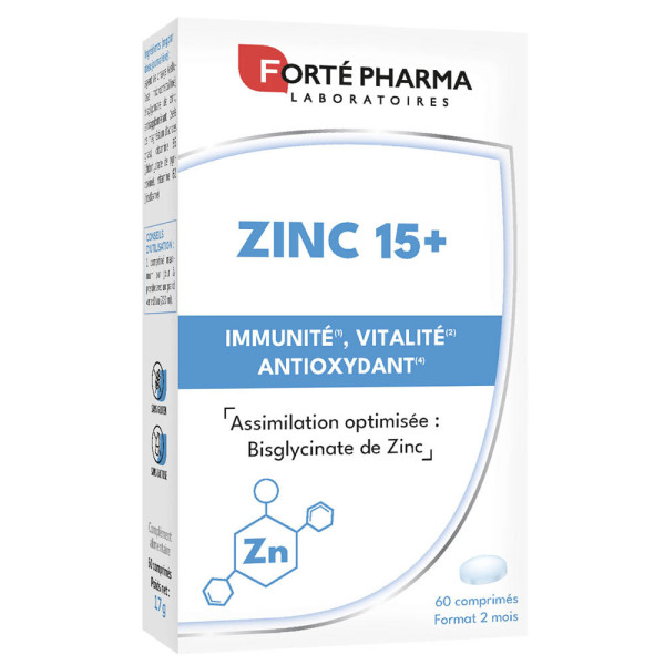 ZINC 15+ de FORTE PHARMA est un complément alimentaire qui apporte un complément de Zinc (15mg par comprimés) sous forme de bisglycinate qui permet une meilleure assimilation par l'organisme. Le Zinc participe au fonctionnement normal du système immunitaire, contribue à protéger les cellules du stress oxydatif ainsi qu’à réduire la fatigue, et participe au maintien d'une peau normale.
