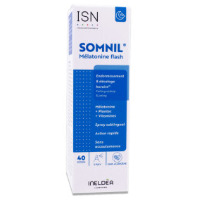 Le laboratoire Ineldea propose une formule innovante avec le complément alimentaire Somnil Mélatonine Flash, combinant mélatonine et extraits de plantes comme la mélisse et la fleur d'oranger, enrichie en vitamines B1 et B6. La mélatonine contribue à réduire le temps d'endormissement et à atténuer les effets du décalage horaire, tandis que la vitamine B6 contribue à réduire la fatigue. Ce spray sublingual à action rapide est conçu pour une utilisation pratique, sans accoutumance ni dépendance, et sans provoquer de somnolence au réveil.