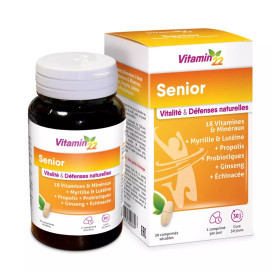 La gamme Vitamin 22 est spécialement conçue pour répondre aux besoins des seniors à partir de 50 ans. Les comprimés Senior Vitalité & Défenses Naturelles sont formulés à base de vitamines, minéraux et extraits de plantes ainsi que de ferments lactiques, lutéine et propolis. Il existe plusieurs nutriments et minéraux qui peuvent aider à réduire la fatigue, tels que les vitamines B2, B3, B5, B6, B9, B12, C, le fer et le magnésium. D'autres nutriments, comme les vitamines A, B6, B9, B12, C, D, le zinc, le fer, le sélénium et le cuivre, peuvent soutenir la fonction immunitaire. Pour améliorer le fonctionnement du système nerveux, il est recommandé de consommer des nutriments tels que les vitamines B1, B2, B3, B6, B8, B12, C et le magnésium. Le zinc et le fer peuvent contribuer à une fonction cognitive normale, y compris la concentration, l'apprentissage et la mémoire. Pour la protection des cellules contre le stress oxydatif, il est conseillé de consommer des nutriments tels que les vitamines B2, C, E, le sélénium, le zinc et le manganèse. La vitamine D est essentielle pour le maintien de l'ossature, de la dentition et de la fonction musculaire, ainsi que pour une calcémie normale. Pour maintenir une bonne vision, il est recommandé de consommer des nutriments tels que les vitamines A, B2, le zinc et l'extrait de myrtille. Le ginseng et l'échinacée peuvent contribuer aux défenses naturelles et au fonctionnement du système immunitaire. Enfin, certains produits peuvent être renforcés en propolis et lutéine pour une efficacité accrue