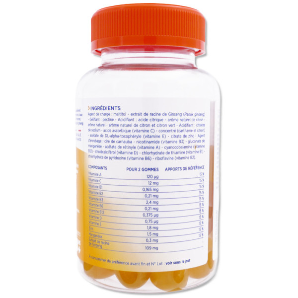 Agent de charge : maltitol - extrait de racine de Ginseng (Panax ginseng) - Gélifiant : pectine - Acidifiant : acide citrique - arôme naturel de citron - arôme naturel - arôme naturel de citron et citron vert - Acidifiant : citrates de sodium - acide ascorbique (vitamine C) - concentré (carthame et citron) - acétate de DL-alpha-tocophéryle (vitamine E) - citrate de zinc - Agent d’enrobage : cire de carnauba - nicotinamide (vitamine B3) - gluconate de manganèse - acétate de rétinyle (vitamine A) - cyanocobalamine (vitamine B12) - cholécalciférol (vitamine D) - chlorhydrate de thiamine (vitamine B1) - chlorhydrate de pyridoxine (vitamine B6) - riboflavine (vitamine B2).