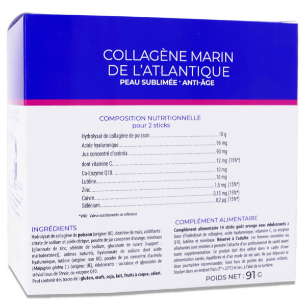 Hydrolysat de collagène de POISSON (origine UE), dextrine de maïs, acidifiants : citrate de sodium et acide citrique, poudre de jus concentré d’orange, minéraux [gluconate de zinc, gluconate de cuivre, sélénite de sodium (support : maltodextrine)], arômes naturels, hyaluronate de sodium dont acide hyaluronique, lutéine (origine non UE), poudre de jus concentré d’acérola (Malpighia glabra L.), édulcorants : sucralose et glycosides de stéviol issus de Stevia, co-enzyme Q10.