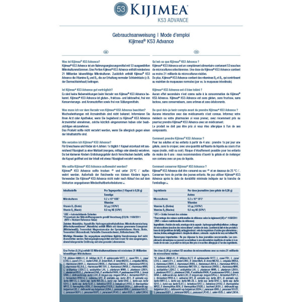 Kijimea® K53 Advance est un complément alimentaire contenant 53 souches spécifiques de micro-organismes. Chaque dose assure au moins 21 milliards de micro-organismes vivants. De plus, il contient les vitamines B3 et B7, qui contribuent au maintien des muqueuses, notamment intestinales.