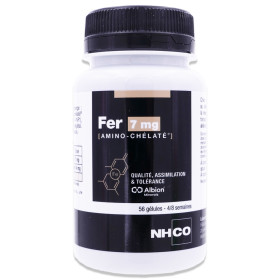 NHCO FER 7MG [AMINO-CHELATE] le complément alimentaire issu de la recherche en micronutrition conditionné en gélules dans votre parapharmacie en ligne, du Fer Amino-Chélaté sous forme bisglycinate qui permet une haute absorption, tolérance digestive et biodisponibilité.