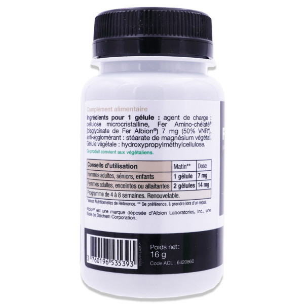 FER 7MG [AMINO-CHELATE] est un complément alimentaire spécialement formulé pour garantir un apport optimal de 7mg de Fer par jour (1 gélule par jour) soit 100% des valeurs nutritionnelles de référence. Le fer est un oligo-élément nécessaire à notre organisme puisqu’il compose l’hémoglobine, la protéine des globules rouges qui transporte l’oxygène dans le sang. Le fer participe au processus de division cellulaire et participe également à réduire la fatigue, à la formation normale de globules rouges et d’hémoglobine, à une fonction cognitive normale, à un métabolisme énergétique normal et au transport normal de l’oxygène dans l’organisme.