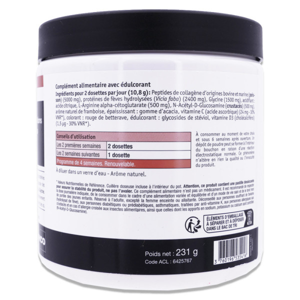 Peptides de collagène d’origines bovine et marine (poisson), protéines de fèves hydrolysées (Vicia faba), Glycine, acidifiant : acide citrique, L-Arginine alpha-cétoglutarate, N-Acétyl-D-Glucosamine (crustacés), arôme naturel de framboise, épaississant : gomme d’acacia, vitamine C (acide ascorbique), colorant : rouge de betterave, édulcorant : glycosides de stéviol, vitamine D3 (cholécalciférol).