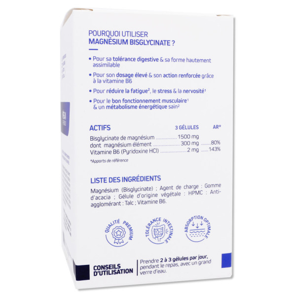 Magnésium (Bisglycinate) ; Agent de charge : Gomme d'acacia ; Gélule d'origine végétale : HPMC : Anti-agglomérant : Talc ; Vitamine B6. ACTIFS POUR 3 GÉLULES : Bisglycinate de magnésium 1500 mg soit magnésium élément 300 mg ; Vitamine B6 (Pyridoxine HCI) .2 mg.
