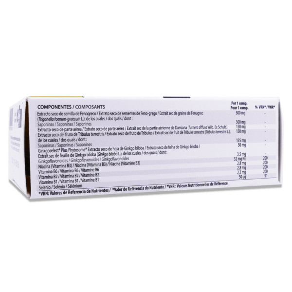 Information nutritionnelle (pour 1 comprimé) / % VNR*:Extrait sec de graine de Fenugrec (Trigonella foenum-graecum L.) : 500 mg dont Saponines : 300 mg Extrait sec de la partie aérienne de Damiana (Turnera diffusa Willd. ex Schult.) : 150 mg Extrait sec de fruit de Tribule terrestre (Tribulus terrestris L.) : 150 mg dont Saponines : 135 mg Extrait sec de feuille de Ginkgo biloba (Ginkgo biloba L.) : 50 mg dont Ginkgoflavonglucosides : 3,5 mg Niacine (Vitamine B3) : 32 mg NE / 200 % VNR* Vitamine B6 : 2,8 mg / 200 % VNR* Vitamine B2 : 2,8 mg / 200 % VNR* Vitamine B1 : 2,2 mg / 200 % VNR* Sélénium : 50 µg / 91 % VNR*. *VNR : Valeurs Nutritionnelles de Référence