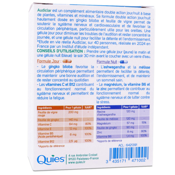 Le laboratoire QUIES propose une solution innovante avec son complément alimentaire Audiclair, conçu pour accompagner votre confort auditif jour et nuit. La formule jour contient du gingko biloba, qui contribue à une circulation sanguine normale, des vitamines C et B12 qui soutiennent le fonctionnement normal du système nerveux et contribuent à réduire la fatigue. La formule nuit intègre de l'ashwagandha et de la mélisse, qui participent à la relaxation pour faciliter l'endormissement et contribuent au maintien d'un sommeil sain. Le magnésium, la vitamine B6 et le zinc soutiennent le fonctionnement normal du système nerveux et contribuent à réduire la fatigue.