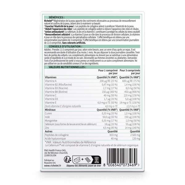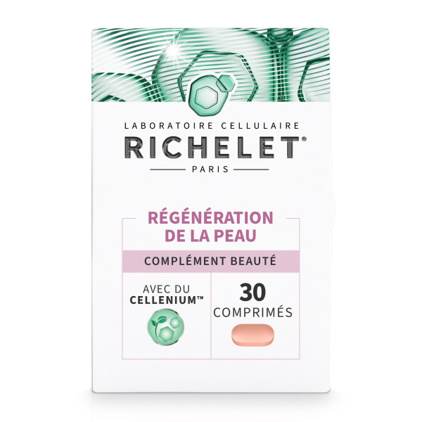 Régénération de la Peau pas cher du laboratoire RICHELET, un complément alimentaire composé de vitamines et minéraux avec des peptides de collagène, sous forme de comprimés, dans votre parapharmacie en ligne à prix pas cher.