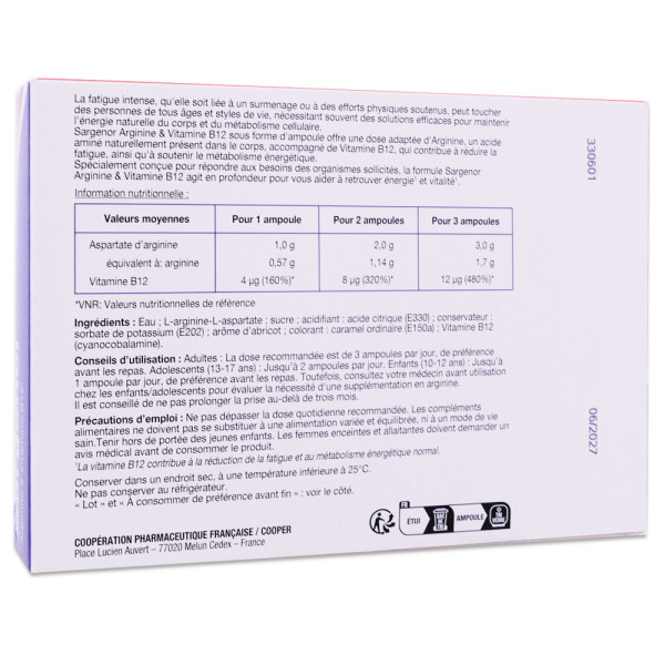 Le labroatoire COOPER propose ce complément alimentaire formulé avec de l'Arginine et de la Vitamine B12. L'Arginine est un acide aminé essentiel, présent dans l'organisme naturellement. La Vitamine B12 contribue au métabolisme énergétique normal et à réduire la sensation de fatigue. Ce produit est agrémenté d'un arôme abricot pour une prise agréable. L'association de ces ingrédients actifs peut participer au maintien de la vitalité et au soutien de l'énergie quotidienne. Offrez à votre corps le soutien dont il a besoin pour faire face aux périodes de fatigue intense et retrouvez un équilibre énergétique optimal.