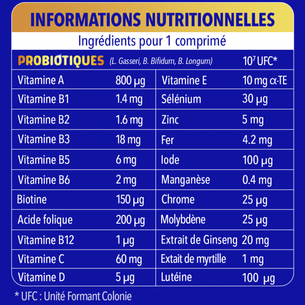 INGREDIENTS: Agents de charge : cellulose ; Sels calciques de l’acide orthophosphorique ; Inuline ; Agent de charge : phosphate de calcium; L-ascorbate de calcium ; Oxyde de magnésium ; Agent d’enrobage : hydroxypropylméthylcellulose ; Dextrose ; Anti-agglomérant : mono- et diglycérides d’acide gras ; Nicotinamide ; Agents de charge : polyvinylpyrrolidone, polyvinylpolypyrrolidone, carboxyméthylcellulose de sodium réticulée ; Acétate de DL- α-tocophéryle ; Agent d’enrobage : hydroxypropylcellulose ; Sirop de glucose; Maltodextrine; Sulfate ferreux ; Dextrine ; Anti-agglomérants: sels de magnésium d’acide gras, dioxyde de silicium, talc; Amidon ; Amidon modifié ; Chlorure de potassium ; Support : carbonate de calcium; Extrait de racine de ginseng (Panax ginseng C.A. Meyer) ; D-pantothénate de calcium ; Oxyde de zinc ; Emulsifiant : gomme d’acacia ; Chlorhydrate de pyridoxine ; Mononitrate de thiamine ; Riboflavine ; Cultures microbiotiques Lactobacillus gasseri PA 16/8, Bifidobacteriumbifidum MF 20/5, Bifidobacteriumlongum SP 07/3 (trace de lait, de poisson et de soja) ; Sucre; Sulfate de manganèse ; Acétate de rétinyle; Colorants : oxydes et hydroxydes de fer, bleu brillant FCF ; Gélatine ; Extrait de fruits de myrtille (Vacciniummyrtillus L.) ; Acide ptéroylmonoglutamique (acide folique) ; Huile de palme ; Lutéine ; Anti-oxydant : acide tartrique ; D-biotine ; Iodure de potassium ; Chlorure de chrome (III) ; Sélénate de sodium ; Molybdate de sodium; Régulateur d’acidité : acide citrique ; Cholécalciférol ; Cyanocobalamine.