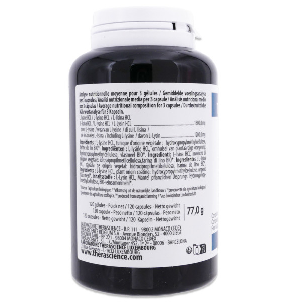 Le laboratoire THERASCIENCE propose une gamme de compléments alimentaires de haute qualité, dont la L-Lysine naturelle issue de fermentation. Chaque dose de 3 gélules végétales apporte 1,5 g de L-Lysine HCL, dont 1,2 g de L-Lysine. La L-Lysine est un acide aminé essentiel pour l'organisme. Ces gélules végétales, faciles à consommer, sont conçues pour s'intégrer aisément dans votre routine quotidienne.