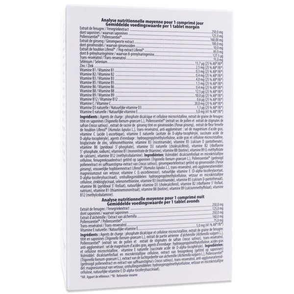 Comprimé jour : Agents de charge : phosphate dicalcique et cellulose microcristalline, extrait de graine de fenugrec titré en saponines (Trigonella foenum-graecum L.), Pollenssentiel® (extrait sec de pollen et extrait de stigmates de safran Crocus sativus) , extrait de racine de ginseng titré en ginsénosides (Panax ginseng), extrait de fleur femelle de houblon Lifenol® (Humulus lupulus L.), trans-resvératrol, anti-agglomérant : sel de magnésium d'acides gras, vitamine C (acide L-ascorbique), vitamine E naturelle (acétate de D-alpha-tocophéryle, succinate acide de D-alpha-tocophéryle), agents d'enrobage : hydroxypropylméthylcellulose, acides gras et cellulose microcristalline, bisglycinate de zinc, sélénométhionine, vitamine B3 (nicotinamide), vitamine B5 (calcium D pantothenate), vitamine B6 (pyridoxal 5′-phosphate), vitamine D3 naturelle (cholécalciférol), vitamine B2 (riboflavine 5′-phosphate, sodium), vitamine B1 (mononitrate de thiamine), vitamine B8 (biotine), vitamine B9 (L-méthylfolate de calcium), vitamine B12 (méthylcobalamine).