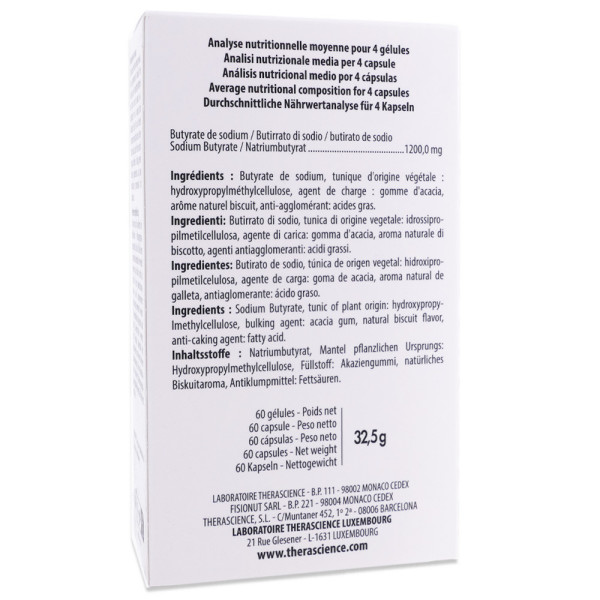 SANS conservateurs, SANS nanoparticules, SANS ingrédients à base de gluten ni de lactose, non testée sur les animaux et fabriqué en Europe, grâce au Clean Label THERASCIENCE. Butyrate de sodium, tunique d’origine végétale, agent de charge : gomme d’acacia, arôme naturel, anti-agglomérant : acides gras. Analyse nutritionnelle pour 4 gélules : Butyrate de sodium 1200,0mg.