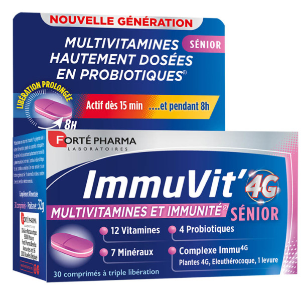 Les laboratoires FORTÉ PHARMA ont élaboré différentes gammes et univers de produits pour vous accompagner dans la vie de tous les jours et vous aider à rester en forme, à préserver votre capital santé et beauté. IMMUVIT’ 4G SENIOR est un complément alimentaire sous forme de comprimés tri-couches pour une libération immédiate et prolongée (8h) à base d'extraits de plantes (dont le gingembre), de vitamines dont la D, ainsi que de Zinc. La vitamine D et le Zinc vont contribuer au maintien du fonctionnement normal du système immunitaire ; le gingembre contribue à soutenir le système immunitaire. La vitamine D va aussi jouer un rôle dans le maintien d’une ossature et une dentition normale et le zinc contribue au maintien d’une vision normale ainsi qu’à une fonction cognitive normale.