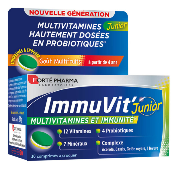 IMMUVIT’ JUNIOR à prix pas cher de FORTE PHARMA, le complément alimentaire sous forme de comprimés tri-couches pour une libération des actifs immédiate et prolongée, dans votre parapharmacie en ligne à prix pas cher. Destiné aux enfants dès 4 ans.