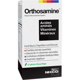 ORTHOSAMINE Acides aminés Vitamines Minéraux du Laboratoire NHCO une alliance d’acides aminés essentiel, de vitamines , de minéraux amino-chélatés et d’extraits de plantes dans un complément alimentaire en gélules dans votre parapharmacie en ligne.