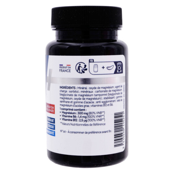 Complément alimentaire à base de vitamines et magnésium. Gomme de xanthane, gomme d'acacia ; minéraux : carbonate de magnésium, bisglycinate de magnésium, oxyde de magnésium ; anti-agglomérant : sels de magnésium d'acide gras ; vitamines : B6, B12. Pour 1 comprimé : Magnésium : 300 mg (80% VNR*) Vitamine B6 : 1,4 mg (100% VNR*) Vitamine B12 : 2,5 µg (100% VNR*) *VNR = Valeurs Nutritionnelles de Référence. La liste des ingrédients peut être soumise à des variations, nous vous conseillons de toujours vérifier la liste figurant sur le produit acheté.