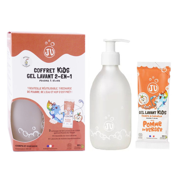 Il est composé d'une poudre à diluer qui se transforme en gel lavant 2 en 1 doux et onctueux. Sa formule est enrichie en agents hydratants et humectants pour hydrater et protéger la peau des enfants. Sa texture légère et sa mousse fine et onctueuse nettoient en douceur et laissent la peau et les cheveux des enfants doux et hydratés. Sa formule est hypoallergénique , pour une sécurité optimale. Sa fragrance fruitée et délicate de pomme du verger procure une sensation de fraîcheur et de bien-être. JU Gel Lavant Kids Poudre à Diluer Pomme du Verger 25g est le produit idéal pour prendre soin de la peau des enfants et de la planète. Pratique par sa recharge, une recharge de 25g de poudre à diluer, équivaut à un flacon de 250ml de gel lavant.